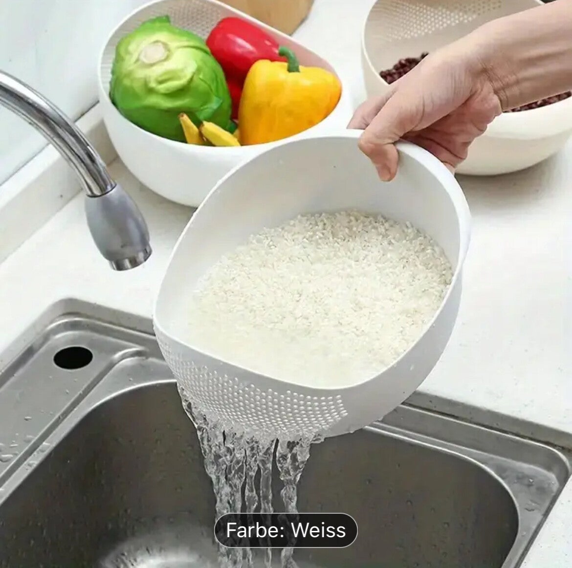 Damit ist das abgiessen von Reis,Nudeln ,und andere Lebensmittel einfach möglich dank der schrägen ausgiess Form bleiben die Lebensmittel in der Schüssel